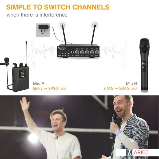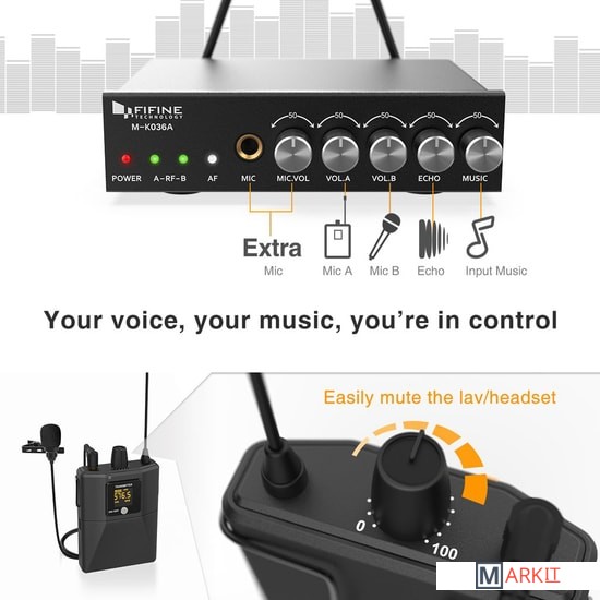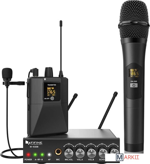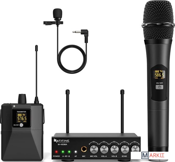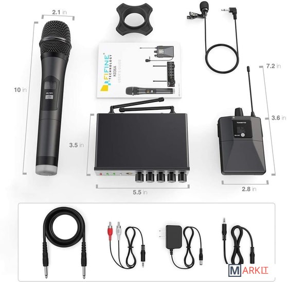 - один радиомикрофон- петличный микрофон- настольный приемник- портативный передатчик- аудиокабель 6.3 мм - 6.3 мм- аудиокабель 3.5 мм - 3.5 мм- аудиокабель 2RCA - 3.5 мм- маркировочное кольцо- адаптер питания- документация |