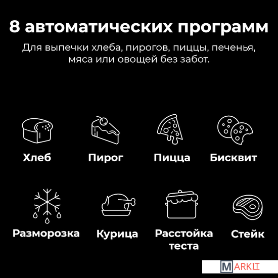 8 автоматических программ приготовления:- хлеб;- пирог;- пицца;- печенье;- стейк;- курица;- расстойка теста;- разморозка.Духовка оснащена верхним и нижним нагревательными элементами с независимым управлением, которые можно дополнительно установить в режим конвекции или гриля для повышения эффективности приготовления.Длина шнура: 0.9 м
