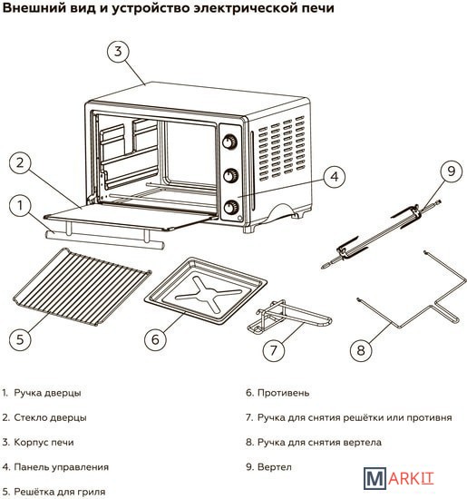 - ручка для снятия противня/решетки;- ручка для снятия вертела. |