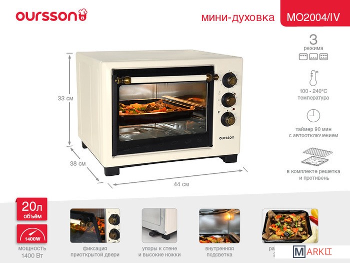 Компактная электрическая мини-печь OURSSON MO2004 объемом 20 литров станет отличным решением даже для маленькой кухни. Печь оптимальна по функционалу и комплектации, проста в управлении, занимает мало места. Благодаря регулировке температуры от 100 до 240 градусов и трем режимам работы можно приготовить любое блюдо: от аппетитной курицы до вкусного, рассыпчатого печенья к чаю. Таймер на 90 минут со звуковым сигналом известит о завершении работы, а функция автоотключения не даст подгореть блюду. В комплекте есть решетка и эмалированный противень.