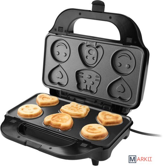В комплекте шесть съемных пластин с антипригарным покрытием: для приготовления тонких и больших сэндвичей, для гриля, вафель, блинов и детского печенья.