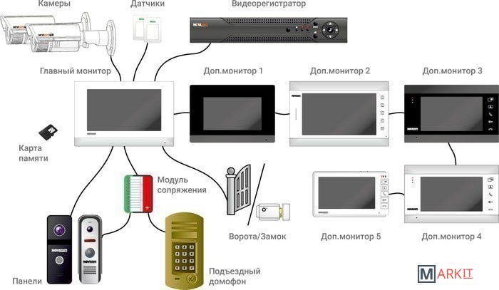 1. Видеодомофон - 1 шт.2. Кронштейн для установки - 1 шт.3. 4-х проводная подготовка - 5 шт.4. 2-х проводная подготовка - 3 шт.5. Крепёжный комплект - 1 шт.6. Руководство пользователя - 1 шт.