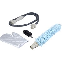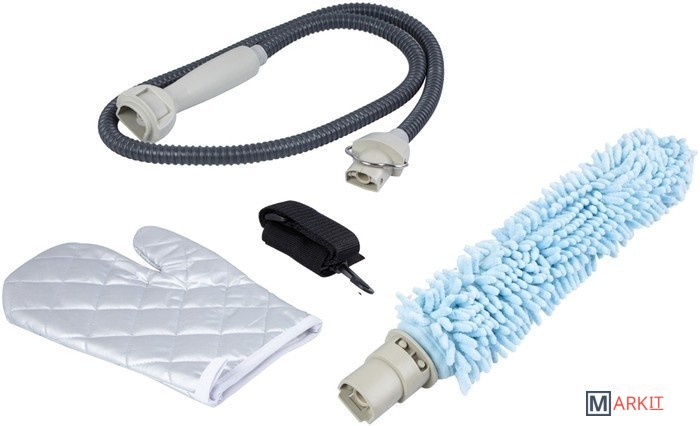 | Комплектация | 1. Съемный чехол из микрофибры с клиновидными волокнами.2. Гибкая насадка-распылитель.3. Гибкий шланг-удлинитель.4. Термоустойчивая защитная рукавица.5. Ремень для переноски отпаривателя/пароочистителя. |