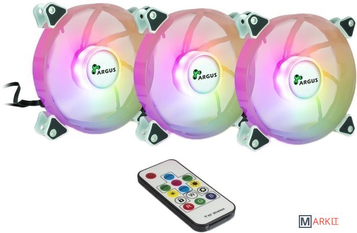 Подключение вентиляторов к контроллеру - 4 pin.2 pin разъем для подключения блока управления RGB к кнопке перезагрузки на корпусе ПК.3 pin для подключения к разъему 5V RGB на материнской плате для синхронного управления всеми светодиодами RGB.В комплекте:3x вентилятора Argus RS-06 RGB LED;контроллер на 8 вентиляторов и 2 светодиодные ленты;2 светодиодные ленты для магнитного крепления в корпусе;пульт ДУ;3pin Y-образный кабель PWM;1x 50 см удлинительный кабель для вентилятора RGB;крепеж;документация.