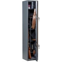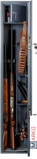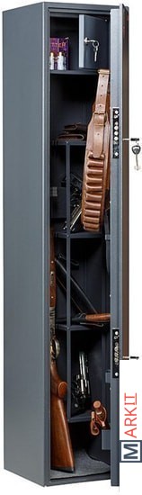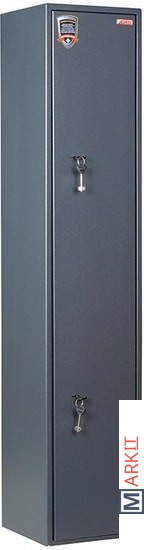 Предназначен для хранения огнестрельного оружия.- толщина металла корпуса и двери – до 2 мм- оборудован патронным отделением, запирающимся на ключ, полками и ложементами для ружей- комплектуется двумя ключевыми замками- максимальная высота ствола 1454 мм- конструкция патронного отделения позволяет размещать оружие, задействуя всю высоту сейфа- наличие анкерных отверстий для крепления сейфа к стене
