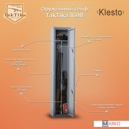 Металлический оружейный шкаф TakTika 1698 идеально подойдет для тех, кому нужен качественный недорогой шкаф для хранения одного ружья. Все просто и надежно, ничего лишнего: съемная полка, отверстия для крепления к полу и стене, 2 почтовых ключевых замка. Мягкий коврик позволит аккуратно и бережно устанавливать ружье без риска повредить приклад. Конструкция шкафа позволяет перевешивать дверь справа налево. Максимальная длина оружия, размещаемого в сейфе - 820 мм. Шкаф покрашен износостойкой порошковой краской.