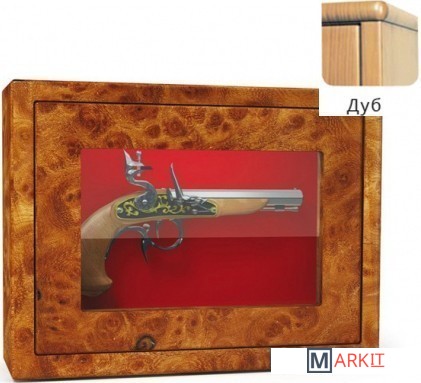 Оружейный взломостойкий сейф с боковыми стенками и застекленной дверью. Многослойное пуленепробиваемое стекло, толщина которого 22 мм, трехсторонняя ригельная система с ручным приводом. Внутренняя отделка — зеленый мокет. Предусмотрено крепление к стене и к полу.