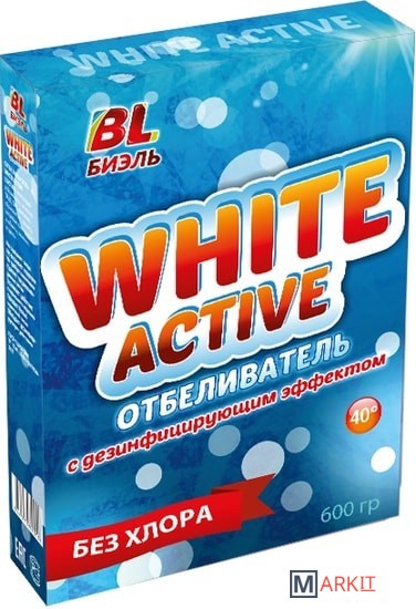 Отбеливатель BL Биэль WHITE ACTIVE предназначен для хлопчатобумажных, льняных, штапельных и вискозных тканей. Отбеливает белый материал и освежает цветную ткань, придавая особенную яркость всей гамме красок. Удаляет пятна чая, кофе, соков, ягод, фруктов, зеленой травы, чернил, ржавчины. Экологически чистый продукт с активным кислородом. Удаляет трудновыводимые пятна на белых тканях, эффективен уже при 30°С. Не содержит хлора. Не вызывает коррозии. Удаляет следы чая, кофе, ягод, соков, фруктов, зеленой травы, чернил, ржавчины. Усиливает действие стирального порошка. Придает белью приятный запах. Состав: кислородный отбеливатель, активатор ТАЭД, ПАВ, комплексообразователи, полимер, натриевые соли сульфата, карбоната, силиката, отдушка .