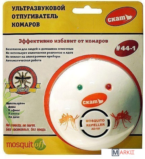 Ультразвуковой отпугиватель комаров Скат 44-1 является эффективным средством борьбы с комарами. Прибор может использоваться в жилых комнатах, на кухне, в офисных помещениях, в больницах, на складах, фермах и т.п. Устройство не использует никаких химических реагентов или ядов.Принцип работы:Ультразвуковой отпугиватель Скат 44-1 является эффективным трех режимным генератором высокочастотных колебания. Насекомые не выдерживают колебаний и покидают помещение. В течении трех дней работы ультразвукового отпугивателя комаров Скат 44-1 всякая активность насекомых в помещении будет прекращена.Для увеличения эффективности рекомендуется периодически менять режимы: «Стрекоза», «Имитация комара 1», «Имитация комара 2». Звуковой диапазон работы находится в области