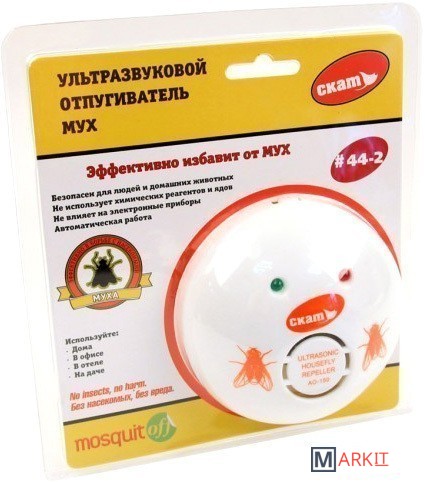 Ультразвуковой отпугиватель мух СКАТ 44-2 это эффективное средство для борьбы с мухами! Принцип действия отпугивателя мух основан на генерировании ультразвуковых волн, которые воздействует на нервную систему насекомых, заставляя их покидать зону работы прибора.Для увеличения эффективности не рекомендуется преграждать воронку действия прибора другими предметами т.к. это сильно снижает радиус его действия.