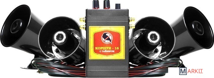 Акустический отпугиватель «Коршун-16»С помощью звукового отпугивателя птиц «Коршун -16», справляются с такими надоедливыми птицами: грачами, дроздами, воронами, скворцами и многими другими.Если пернатые вредители повадились на аэродромы, сады, виноградники или огороды – самое время купить акустический отпугиватель. Устройство прибораКомплект модульный, в него входит: корпус (электронный блок управления), четыре динамика-излучателя и три регулятора (для выбора звука, его мощности и настроек таймера). Разворачивать динамики-рупоры удобно в любую из сторон.Материал устройства – прочный пластик, который хорошо зарекомендовал себя на открытом воздухе, в условиях негативного воздействия атмосферных явлений.Работает отпугиватель от электросети (с помощью адаптера 220 В, который есть в комплекте) или аккумуляторной батареи 12 В (в комплекте не предусмотрена).Особенности работыЗаписанный звук – а именно голоса хищных птиц или другие тревожные звуки – воспроизводится с определенной частотой. Наличие таймера позволяет работать устройству в то время, когда птицы бодрствуют, и отключаться, когда они отправляются для ночевки. Запускает работу фотоэлемент, который и реагирует на свет (потому так важно его ничем не затенить, иначе прибор не сработает).Радиус достаточно обширный – около 15 га открытой площади.Варианты звукового содержанияЗвуковые комбинации можно выбрать из нашего ассортимента. Это запись для индивидуальных случаев, а также три стандартных записи.Первая отпугнет мелких вредителей, скворцов или дроздов. Вторая – со звуками, пугающими семейство вороновых (в него входят грач, галка, сорока и ворона). Эти два варианта – специализированные. Это значит, звуковой диапазон очень обширный.Есть еще запись со смешанными звуками голосов разных птиц: сорок, скворцов, дроздов, ворон и галок. Как лучше установить устройствоМонтируется прибор с помощью скобы. Разместить лучше всего подальше от попадания воды (может повредить электротехнику) и воздействия ультрафиолета (несмотря на свою прочность, от постоянных палящих лучей солнца корпус может потрескаться). Если монтировать на открытой местности, достаточно притенить с помощью козырька или навеса.А чтобы эффект был лучше, дополнительно нужно смонтировать и визуальные отпугиватели: динамический отпугиватель птиц или макеты хищной птицы. Так для птиц-вредителей эффект присутствия хищников будет более реалистичным.