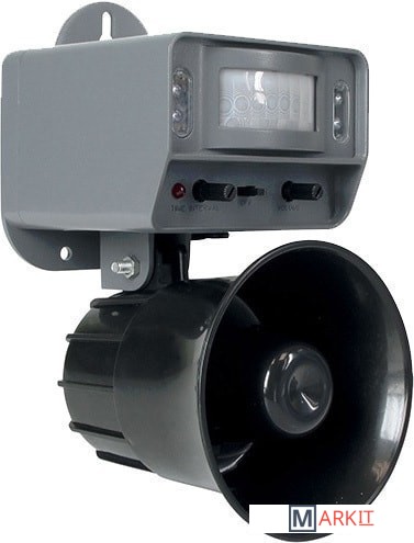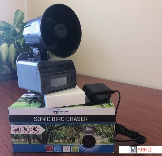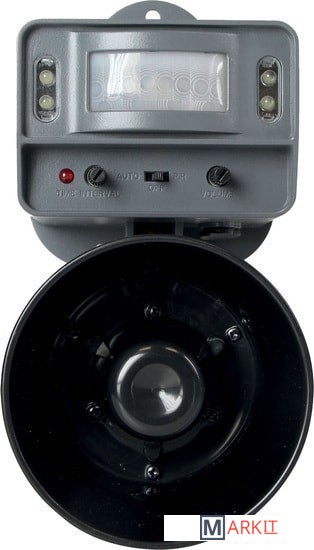 Биоакустический отпугиватель птиц "WK0108" предназначен для защиты открытой территории площадью до 400 кв. м от пернатых вредителей (ворон, голубей, скворцов и т.д.) Выделяется среди аналогов не только высоким качеством записанных голосов хищников, но и наличием светодиодного стробоскопа для усиления отпугивающего эффекта. Прибор имеет 2 режима срабатывания: по датчику движения и автоматический, может выключаться самостоятельно в темное время суток благодаря встроенному фотодатчику. Питается от сети 220 В или автономно, от 4 батареек "АА". - Площадь отпугивания — до 400 м2. Такой зоны действия будет вполне достаточно, чтобы прогнать пернатых с территории садового, дачного или коттеджного участка, террасы, игровой площадки, автопарковки и т.д. При этом устройство не будет своим шумом мешать вашим соседям.- Встроенный светодиодный стробоскоп. Усиливает эффективность работы отпугивателя за счет визуального воздействия на органы зрения птиц. Яркие световые вспышки дезориентируют и пугают пернатых.- 2 режима работы: автоматический или по сигналу датчику движения. В зависимости от сценария использования прибор можно перевести в автоматический режим генерации тревожных криков (периодичность настраивается в интервале от 4 до 25 мин.) или же установить срабатывание при активации датчика движения. Датчик способен "увидеть" птиц с расстояния до 7-8 м и имеет угол обнаружения 130°.- Регулировка громкости отпугивающего сигнала. Плавная настройка громкости позволит уменьшить шум от прибора в тех случаях, когда вам не требуется его максимальная мощность. Например, если объект охраны — небольшая мансарда, балкон или беседка.- Автоотключение в ночное время. В корпус устройства встроен фотодатчик, который переведет отпугиватель в "спящее" состояние, как только стемнеет. Ночью птицы неактивны, поэтому защита от них не требуется. Эта функция особенно актуальна, если вы используете прибор в автоматическом режиме.- Возможность автономной работы от батареек. Если нет возможности подключения изделия к сети (например, на неэлектрифицированном объекте), то запитайте его от 4 батареек типа "АА".