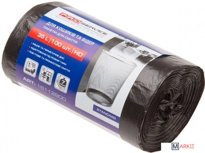 Пакеты для мусора PROservice Standard 35 л 100 штук черные (16112800) полиэтилен высокого давления (HDPE) имеют оптимальный набор характеристик и идеально подходят для офисных корзин и стандартных мусорных ведер объемом 5-12 литров. Толщина: 7 мкм.
