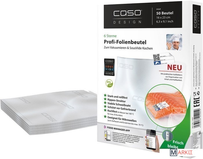 Очень прочная и устойчивая к разрыву плёнка толщиной 160 мкм.Рифлёная структура пакета для создания вакуума.Крепкий и надёжный шов.В комплекте стикеры с QR-кодом для маркировки.Витамины и минералы сохраняются дольше.Плёнка без BPA.Защищает продукты от морозного ожога и потери аромата.Возможно многоразовое использовании и мойка в ПММ.Допускается приготовление продуктов при 100 ° C максимум 4 часа и в СВЧ до 70 ° C.Идеально подходит для Sous Vide.Подходит для всех бескамерных вакуумных упаковщиков.Используйте приложение CASO FOOD MANAGER для сканирования стикеров с QR-кодом и маркируете пакеты с продуктами. Таким образом, у вас всегда будет четкое представление о том, что находится в вашем холодильнике или морозильной камере, а так же Вы получите оповещение на свой телефон об окончании срока годности.Составляйте список продуктов с возможностью сортировки по типу продуктов (рыба, мясо, овощи) или месту хранения (холодильник/морозильник/шкаф).