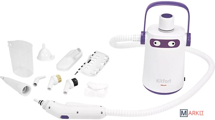 Пароочиститель Kitfort КТ-9109 способен заменить дезинфектор, стеклоочиститель и отпариватель для тканей. Главное преимущество пароочистителя — прибор безопасен для здоровья человека и не приносит вреда окружающей среде.Вы можете использовать пароочиститель как с насадками, так и без насадок. Для подсоединения струйной насадки установите ее на паровое сопло пистолета до упора и поворачивайте кольцо струйной насадки справа налево для фиксации.Все необходимые насадки уже в комплекте. Они быстро вернут сияющий блеск вашей плите или варочной поверхности, помогут добраться до труднодоступных мест и многое другое.В комплекте с пароочистителем идёт мерный стакан и воронка для удобного добавления воды в бойлер. Ёмкость бойлера составляет: 0,3 л.Пароочиститель Kitfort КТ-9109 обеспечивает деликатную глажку вещей. На овальную насадку надевается насадка из микрофибры, которая хорошо впитывает влагу, что очень удобно при отпаривании одежды.Пароочиститель очень компактный и лёгкий. На корпусе есть ручка для переноски. Наша техника порадует вас интересным дизайном. В любой момент вы можете отклеить креативный стикер «глаза» без вреда для поверхности.В пароочистителе предусмотрен блокиратор от случайного нажатия кнопки подачи пара. Чтобы включить подачу пара, сдвиньте блокиратор в сторону открытого замка, и нажмите на кнопку подачи пара. Силой нажатия можно регулировать интенсивность подачи пара.Горячий пар под давлением может удалять грязь, жир и известковые отложения с различных поверхностей, убивать бактерии и домашних клещей. Пароочиститель очищает паром без добавления бытовой химии, что является отличным выбором для аллергиков.Пароочиститель КТ-9109 имеет небольшой вес и габариты. В комплекте с устройством прилагаются насадки для разнообразных видов уборки.