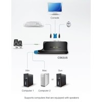 2-портовый USB KVM переключатель, используя который CS62US можно управлять и контролировать 2 компьютера с помощью одной USB консоли.Порт мыши USB может использоваться для подключения USB-концентратора или подкkючения периферийного USB устройства для общего пользования.Особенности:Доступ к управлению двумя компьютерами USB с одной USB консолиКомпактная конструкция, включая 0,9 м кабелейВыбор языка ОС и клавиатуры с помощью горячих клавишВыбор компьютера – горячими клавишами или мышью USBПоддержка нескольких платформ – Windows, Linux, Mac и SunVideo DynaSync ™ – это эксклюзивная технология ATEN, которая позволяет обойти проблемы с дисплеем при загрузке и оптимизировать разрешение при переключении между портамиЭмуляция/обход порта мыши с поддержкой большинства драйверов мышиПорт мыши USB может использоваться для подключения USB-концентратора или подключения периферийного USB устройства для общего пользования *Поддержка игровых клавиатурПоддержка многофункциональных и беспроводных клавиатур и мышейКонструкция «все в одном»Поддержка динамиковРазрешение видео - 2048 x 1536;Поддержка DDC2BФункция автосканирования для отслеживания работы компьютеровНе теребуется внешнее электропитаниеПоддержка и эмуляция* клавиатур Sun/Mac