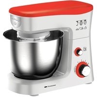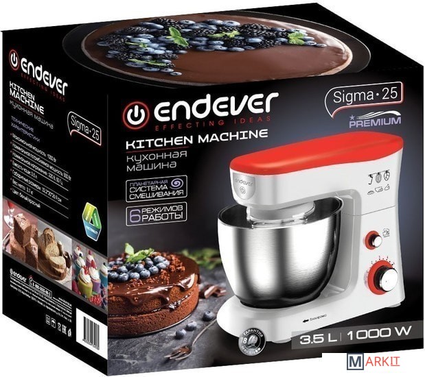 Планетарный миксер.Съемная чаша с крышкой.Насадка для перемешивания.Крюк для теста.Венчик для взбивания.Лопатка кулинарная.Гарантийный талон.Руководство по эксплуатации.