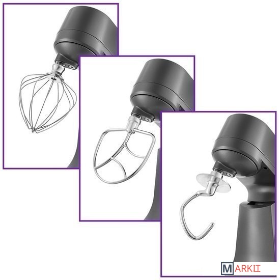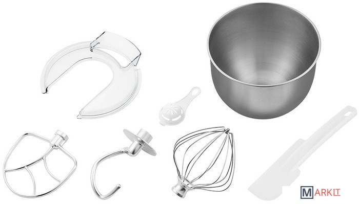 Планетарный миксер.Насадка для смешивания.Насадка-венчик.Крюк для теста.Защитная крышка на чашу.Лопатка.Сепаратор для яиц. |