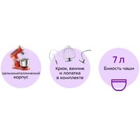 - моторный блок;- чаша миксера;- крышка чаши миксера;- венчик для сбивания;- насадка для смешивания;- крюк для замеса теста;- заглушка;- руководство по эксплуатации.