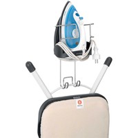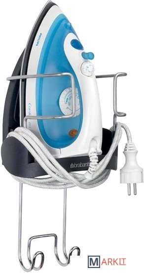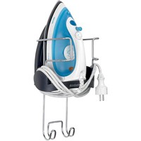 Подходит для всех распространенных моделей (паровых) утюгов.Можно ставить неостывший утюг – подставка из термостойкого металла.Удобное хранение гладильной доски – прочный стальной крюк для подвешивания.Фиксация провода – удобный держатель.Размеры: 38.1x16x19.5 см.Вес: 500 г.