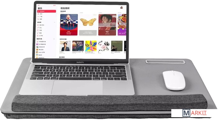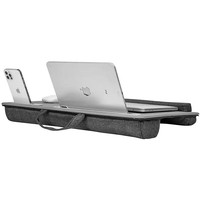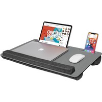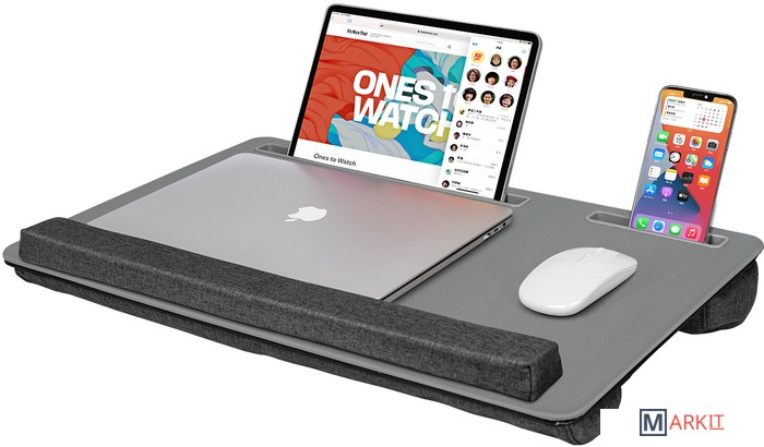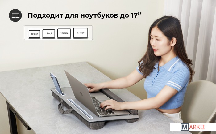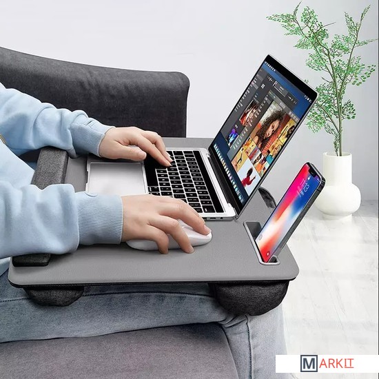 Подставка для ноутбука с мягким основанием. Подходит для ноутбуков до 17 дюймов. Со слотом для установки планшета, слотом для мобильного телефона. Столешница обтянута износостойкой искусственной кожей PU. Мягкий упор для запястий состоит из спонжевого наполнения (сверхплотная пена) в тканевой обивке. Две подушки с наполнением из поролоновых частиц в тканевой обивке для удобного расположения подставки на коленях. Подходит для правшей и левшей. Материал корпуса: MDF + экокожа PUРазмер продукта: 550 х 350 х 65 мм