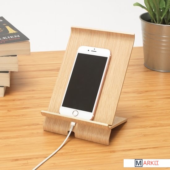 В нижней панели легкой складной подставки СИГФИН есть удобное отверстие для шнура зарядного устройства. Можно спокойно общаться в видеочате, не опасаясь, что заряд телефона закончится. Когда в подставке нет необходимости, ее можно сложить и убрать.Рассчитано на 1 мобильный телефон шириной макс. 12 см и высотой макс. 16 см.Многослойный клееный шпон, Прозрачный акриловый лак, Бамбуковый шпон