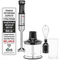 Блендер погружной ARESA AR-1124 – прибор который соответствует всем сертификационным нормам. Блендер ARESA AR-1124 прошел контроль в лаборатории при Министерстве Здравоохранения Республики Беларусь и не выделяет вредных веществ в продукты во время приготовления. Блендер ARESA AR-1124 может быть использован при приготовлении продуктов для детского питания. Блендер ARESA AR-1124 обладает мощным медным мотором - 800 Ватт. Благодаря наличию медного двигателя, модель прослужит гораздо дольше более дешевых аналогов. Благодаря наличию плавной регулировки скорости и ТУРБО режима наш прибор всегда может быть настроен на оптимальную скорость при работе с любыми продуктами. Комплектация блендера ARESA AR-1124 включает: металлическую ножку блендера с 4-лопастным ножом, изготовленной из высококачественной стали, мерный стакан с крышкой, чаша для измельчения, нож из высококачественной стали для измельчения, венчик из прочной стали. ARESA – белорусский бренд бытовой техники. Наша техника проходит сертификацию на территории Республики Беларусь в едином центре ГОССТАНДАРТА. Кроме сертификатов таможенного союза, полученных на территории Республики Беларусь, техника ARESA соответствует всем нормам сертификации Европейского Союза и поставляется на его территорию. Приобретая нашу технику, вы заботитесь о здоровье и безопасности вас и ваших близких.