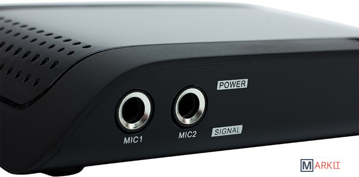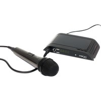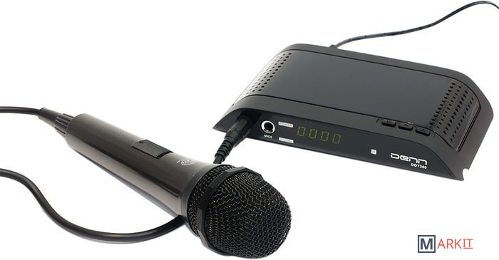 Приставку Denn DDT300 можно использовать в качестве караоке. Она укомплектована двумя входами 6,3 мм для микрофонов, один из которых идет в комплекте.