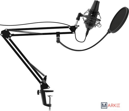 Конденсаторный микрофон с 16 миллиметровой диафрагмой на стойке-пантографе со струбциной, позволяющей закрепить устройство на столе или любой другой плоской поверхности. Предназначен для деятельности в таких сферах как: skype, звукозапись, игры, стриминг.