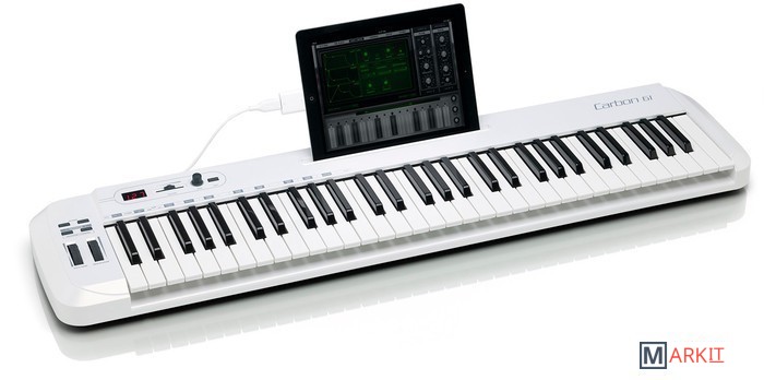Samson Carbon 61 в первую очередь выделяется возможностью подключения планшета Apple iPad с использованием Apple iPad Camera Connection Kit. Специальная подставка позволяет размещать iPad на корпусе клавиатуры, а при необходимости можно запитать Carbon 61 от планшета.