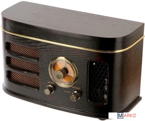 Это наилучший вариант, чтобы украсить интерьер любого помещения под старину. Такой новый-старый радиоприемник с электронной лампой, изумительным дизайном, замечательным образом передающий дух времен начала ХХ столетия, окажется лучшим подарком или приобретением для любителя вещей, оформленных под старину. Рассматриваемая модель способна принимать радиосигнал в диапазонах AM/FM. Регуляторы громкости, настройки радиочастоты и переключатель диапазона находятся на передней панели. Здесь, под декоративной решеткой расположили 4-дюймовый динамик. Электронная лампа будет гореть непрерывно пока работает радио. Для достижения более чистого звука через встроенную магнитную антенну, Вы можете поворачивать корпус радио. Также можно вытянуть антенну-кабель, отрегулировав ее длину и положение.