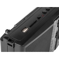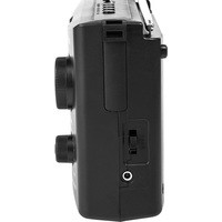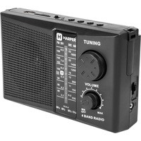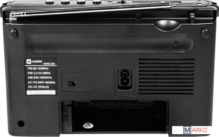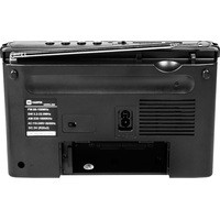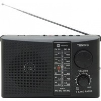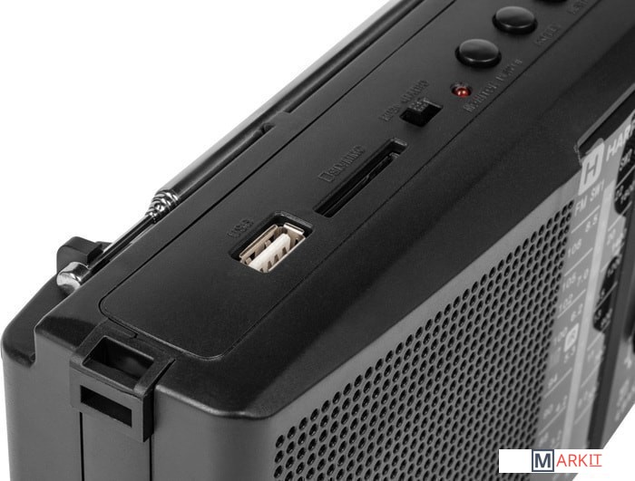 Радиоприемник оснащен одним динамиком 89 мм с номинальным сопротивлением 6 Ом. Частота приема FM-сигнала 88-108 МГц, AM-сигнала 530-1600 КГц, SW-сигнала 3.2-22 МГц. В комплект поставки входят: ремешок для переноски и кабель питания.