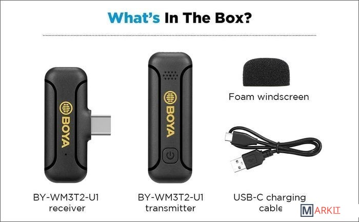 - портативный приемник- портативный передатчик со встроенным микрофоном- поролоновая ветрозащита- кабель для зарядки- документация |