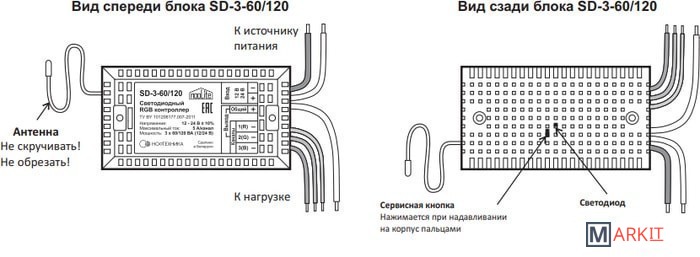 Система nooLite – это технология умного дома, которая позволяет управлять электроприборами по радиоканалу (частота 433,92 МГц).Силовой блок – это устройство, которое подключается к нагрузке (например, к светильнику) и управляет им, получая по радиоканалу команды, поэтому для его эксплуатации необходимо управляющее устройство nooLite (пульт, датчик движения, датчик температуры/влажности, Ethernet-шлюз и т.п.).Радиоуправляемый светодиодный RGB контроллер (силовой блок) nooLite SD-3-60/120 предназначен для управления светодиодной лентой на напряжение 12/24В. Он имеет два режима работы:- Режим 1. Управление одноцветной светодиодной лентой, 3 канала (установлен по умолчанию).- Режим 2. Управление трехцветной RGB светодиодной лентой, 1 канал.