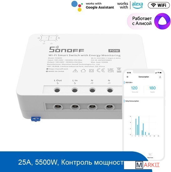 Sonoff POWR3 это интеллектуальный переключатель высокой мощности.25А /5500 В. POWR3 имеет наивысшую выходную мощность, чтобы сделать ваши мощные устройства интеллектуальными, или в качестве единственного комнатного счетчика для измерения энергопотребления.Измерение энергопотребления. Следите за активной мощностью, током и напряжением ваших устройств в приложении.Защита от перегрузки. При обнаружении неисправности питание будет отключено, чтобы избежать повреждения устройства и возникновения опасности.Дистанционное включение/выключение одним нажатием. Может отключать электричество, где бы вы ни находились, что может обеспечить безопасность ваших приборов и сэкономить на скрытых счетах за электроэнергию.Голосовое управление. Совместимость с Amazon Alexa, Google Assistant, SmartThings и Алиса.
