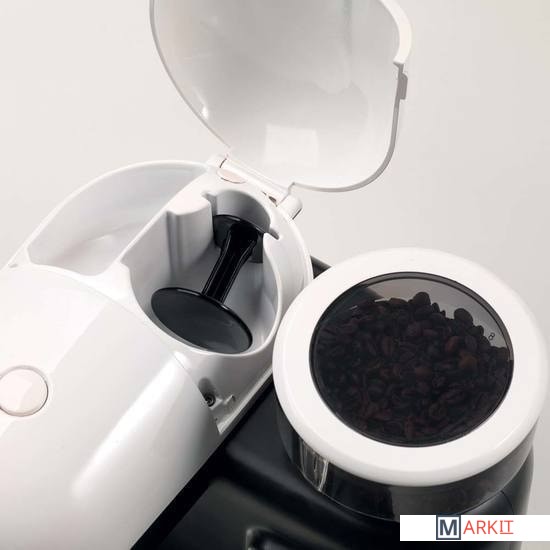 Съёмный резервуар для воды. Капли попадают в специальный съёмный поддон – на столешнице будет сухо и чисто. У этой модели механическое кнопочное управление, разобраться в настройках не составит труда. Одновременно можно приготовить две чашки. Через 30 минут простоя кофеварка автоматически отключается.Мощность: 920-1080 Вт.