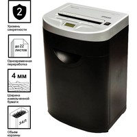 Уничтожитель документов (шредер) BRAUBERG S22 предназначен для уничтожения документов, компакт-дисков и пластиковых карт (банковских, дисконтных и прочих), потерявших актуальность.Отлично подходит для интенсивного персонального использования или коллективного использования в среднем офисе. Резка на полоски размером 4 мм обеспечивает P-2 уровень секретности (DIN 66399). Рекомендуемое количество пользователей — до 10 человек. За один раз уничтожает 22 листа формата А4. Объем корзины составляет 34 л.Дополнительным преимуществом данной модели является наличие функции энергосберегающего режима, т. е. когда аппарат не используется некоторое время — он находится в режиме готовности, но при этом снижается потребление энергии. Аппарат включится автоматически в момент начала уничтожения бумаги/компакт-диска/пластиковой карты.Данный уничтожитель снабжен надежными ножами, способными уничтожать скобы от степлера, что облегчает уничтожение скрепленных документов, экономя время потребителя. Отличительной чертой уничтожителя документов BRAUBERG является низкий уровень шума — всего до 56 Дб, т. е. тише, чем звук, издаваемый электробритвой. Шредер оснащен защитой двигателя от перегрева, что является частой причиной выхода из строя этой дорогостоящей запчасти на уничтожителях бумаги других производителей. Под входом для пластиковых карт/компакт-дисков предусмотрена отдельная небольшая корзина для того, чтобы отходы от карт и дисков не смешивались с отходами от бумаги, уничтожаемой через основной вход. Уничтожитель можно легко перемещать по офису, поскольку он оснащен колесами. При его установке в определенном месте можно зафиксировать передние колеса, чтобы шредер не перемещался.