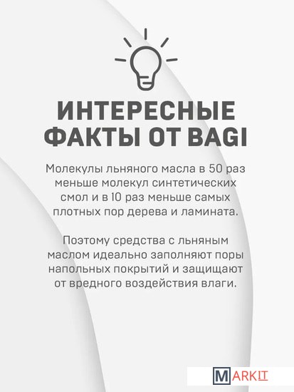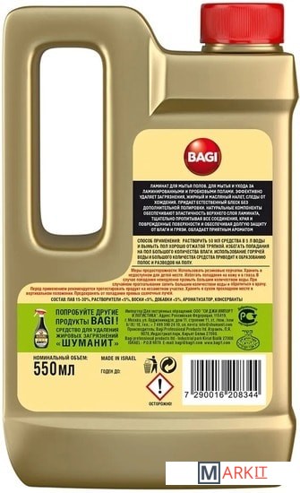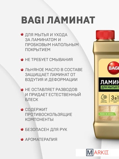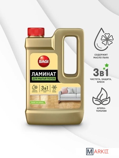 BAGI Ламинат – специализированное средство для ухода за ламинатом и пробковым напольным покрытием. Не оставляет разводов. Содержит льняное масло, которое ухаживает за поверхностью и защищает от вздутия и деформации.• Удаляет стойкие загрязнения, жирный налет, пыль, грязь, шерсть животных.• Не требует смывания и придает блеск.• Содержит противоскользящие компоненты.• Безопасен для детей и домашних животных.• Приятный запах.
