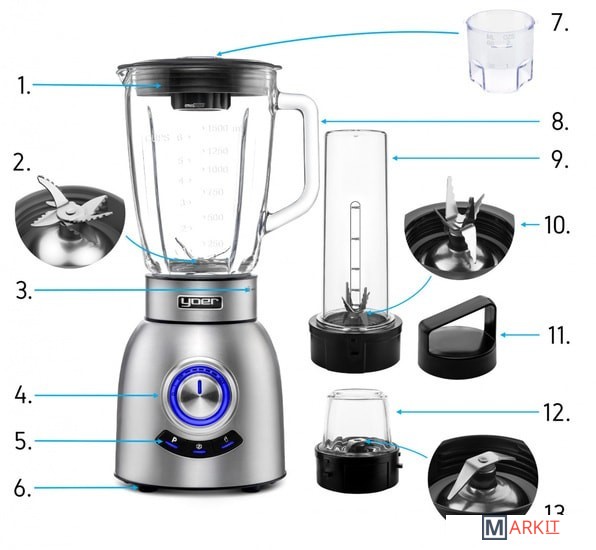 3 НАБОРЫ ЛЕЗВИЙБлендер оснащен 3 наборами лезвий из нержавеющей стали, которые легко измельчают фрукты, овощи и измельчают лед. При подаче мощности 1000 Вт лезвия позволяют быстро получить мягкую текстуру смузи.Специальные лезвия для кувшина - 6 стальных лезвий, предназначенных для полного измельчения или измельчения содержимого кувшина.Специальные лезвия для чашек - 6 стальных лезвий, расположенных в вертикальном положении, позволяют приготовить полезный смузи в удобной чашке.Специальные лезвия для кофемолки - плоские лезвия для всестороннего измельчения кофе, орехов или зелени.19500 об / мин.Максимальная емкость кушина 2,5 л.Прочный стеклянный кувшин с профилированным носиком, функциональная емкость кувшина: 1,5 л.6 лезвий из нержавеющей стали.ПредохранительРучка с подсветкойПанель управления с 3 автоматическими программамиКрышка кувшина со съемной меркой.Эргономичная ручка кувшинаПрочная чашкаСпециальный набор лезвий для чашекУдобная завинчивающаяся крышка чашкиАвтоматическое количество программ: 3Противоскользящие ножки, отверстие для крышки кувшина-4,5 см, измеритель крышки кувшина, функциональные клавиши с подсветкой.В комплекте идет удобная чашка с крышкой, которую можно брать с собой на работу или в школу. Благодаря модульной конструкции чашку можно подсоединить прямо к основанию блендера, чтобы приготовить готовый смузи всего за несколько секунд. Емкость чашки 500 мл.Польская вилка питания 230 В ~ 50 Гц