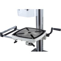 Цифровая индикация скорости вращения шпинделяРегулируемый ограничитель глубины сверленияКонтроль глубины сверления по лимбуМиллиметровая шкала для контроля глубины сверленияЛазерный указатель оси сверленияСветодиодный фонарь подсветкиПлавная регулировка скорости вращения шпинделя без переустановки ремня (вариатор)Цифровое отображение частоты вращенияРабочий стол из чугунного литьяВыдвижное расширение рабочего столаРегулировка высоты установки рабочего стола при помощи вращающейся рукояткиРегулировка наклона рабочего столаБыстрозажимной сверлильный патронПоворотный рабочий столЧетыре Т-образных паза в столеJWDP-12 — настольный сверлильный станок профессионального класса, подходящий для универсального (дерево и металл) применения. Основная отличительная черта этой модели – клиноременный вариатор, позволяющий плавно бесступенчато изменять скорость вращения шпинделя. Такая конструкция механизма ускоряет настройку в зависимости от диаметра сверления: вместо снятия и последующей установки ремня достаточно перевести рычаг, причем делают это, не выключая мотор. При этом фактическая скорость вращения шпинделя будет отображаться на цифровом дисплее, что особенно важно при работе с металлом, когда ограничения по частоте вращения режущего инструмента гораздо более строгие, чем при работе с деревом.Станок оборудован массивным чугунным столом, имеющим Т-образные пазы для крепления тисков. Стол установлен на литом кронштейне, поворачивается вокруг своей оси и наклоняется влево и вправо на угол до 45 градусов. Кронштейн перемещается вверх и вниз по колонне благодаря зубчато-реечному механизму с вращающейся рукояткой. Рабочая поверхность для установки тисков отфрезерована и на основании, что позволяет работать от него, предварительно сняв или отвернув в сторону стол.Подача пиноли производится стандартным штурвалом с тремя рукоятками, на его оси лимб для контроля глубины сверления. Кроме того. есть винтовой ограничитель с собственной миллиметровой шкалой, облегчающей настройку положения гайки-стопора. Вес подвижной части (шпиндель, быстрозажимной патрон, режущий инструмент) частично компенсируется спиральной пружиной, у которой можно менять предварительный натяг.Предусмотрен светодиодный фонарик с выключателем для подсветки рабочей области и лазерный указатель оси сверления.