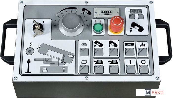 Полуавтоматический ленточнопильный станок по металлу JET MBS-2026DAS. Плавная регулировка скорости вращения полотна. Подъем и опускания пильной рамы с пульта в отладочном режиме. Также на пульте запуск цикла, пуск гидравлики и включение СОЖ.