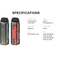 - кабель для зарядки (USB Type-C)- картридж 4 мл- испаритель 0.6 Ом- испаритель 0.8 Ом- документация |