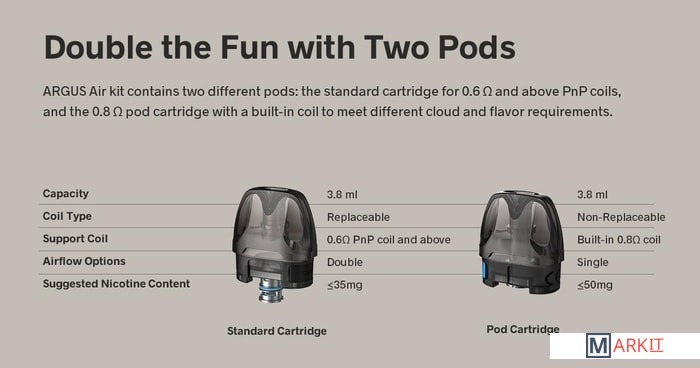 - картридж 3.8 мл (с узким отверстием воздуховода)- картридж 3.8 мл (с широким отверстием воздуховода)- испаритель 0.6 Ом- испаритель 0.8 Ом- кабель для зарядки (USB Type-C)- документация |