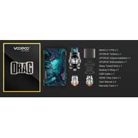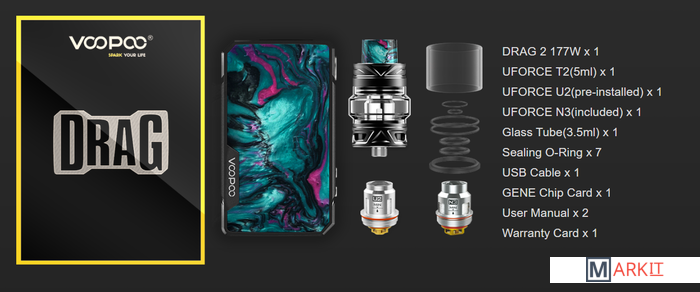 | Комплектация | DRAG 2 177W x 1UFORCE T2 (5 ml) x 1UFORCE U2 (pre-installed) x 1UFORCE N3 (included) x 1Glass Tube (3.5 ml) x 1Sealing O-Ring x 7USB Cable x 1 GENE Chip Card x 1User Manual x 2Warranty Card x 1 |