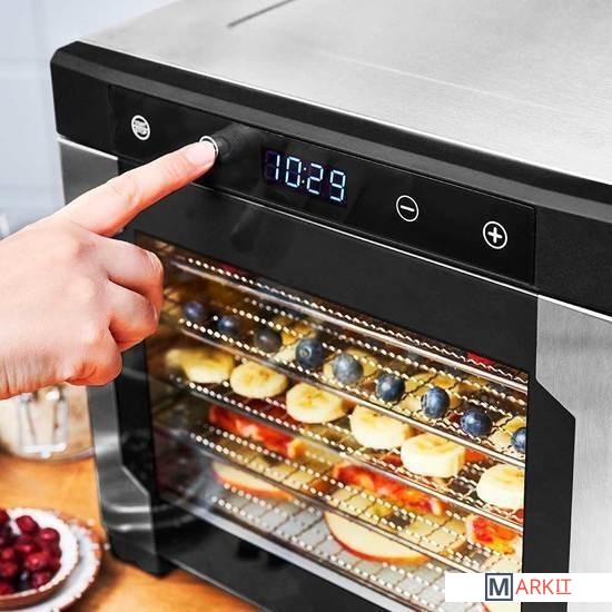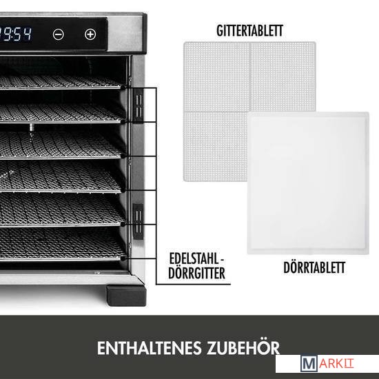 Светодиодный дисплей, 24-часовой таймер с автоматическим отключением6 сушильных решеток из нержавеющей стали, площадь сушки 990 см² на решетку, общая площадь 5940 см²1 сушильный лоток, например, для намазывания фруктовой массы для приготовления фруктовой кожицы1 сетчатый лоток, идеально подходящий, например, для трав, ягод или цветов1 форма для батончиков мюсли на 15 батончиков домашнего приготовленияКорпус из нержавеющей стали, 600 ВтНасадки можно мыть в посудомоечной машинеДлина шнура питания: прибл. 105 см