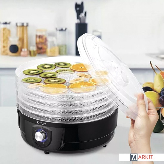 Полезные лакомства круглый год!Электрическая сушилка КТ-1928 предназначена для сушки овощей, фруктов, ягод, грибов, корнеплодов, трав и зелени, а также хлеба. С электросушилкой Kitfort KT-1928 у вас всегда под рукой будет полезная и вкусная еда.Вращающиеся поддоныВ сушилке установлен вал, благодаря которому поддоны вращаются вокруг своей оси, что обеспечивает идеальную сушку продуктов!Управляйте процессом сушки!На передней панели устройства есть регулятор, с помощью которого вы можете включить и выключить устройство, установить температуру в диапазоне от 40 до 70°C. Регулятор имеет плавное переключение температур.Наблюдайте за сушкой!Сушилка имеет в комплекте 5 поддонов из прозрачного пластика, поэтому вы легко можете наблюдать за процессом сушки любимых продуктов. Устанавливайте от 1 до 5 поддонов друг на друга в зависимости от количества продуктов.Равномерная сушкаСушилка оборудована мощным нагревательным элементом и вентилятором, благодаря которым нагретый воздух равномерно распределяется по всему объёму камеры. Прибор КТ-1928 создаёт идеальные условия для качественной сушки продуктов.Легко разобрать и очистить!Все поддоны легко снимаются и моются после сушки. Если на поддоны налипли продукты, замочите их на некоторое время в тёплой воде. После мойки протрите поддоны полотенцем и просушите их.Быстро и вкусно!Для более быстрой сушки порежьте продукты на кусочки. Чем мельче кусочки, тем быстрее они высохнут. При сушке ягод и прочих мелких продуктов положите на поддоны марлю, чтобы ягоды не проваливались сквозь ячейки.Длина шнура: 1 м.Диаметр поддонов: 310 мм.Уровень шума: 40 дБ.