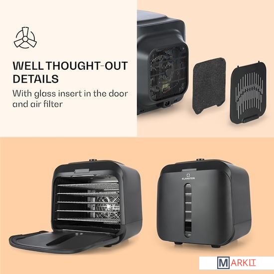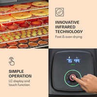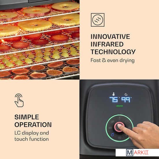 Klarstein Флорида солонина Дегидратор сушит фрукты, овощи, мясо и другие пищевые продукты с использованием инфракрасной технологии при скорости записи, что позволяет производство натуральных фруктов и ингредиентов.Благодаря тепловой мощности 500 Вт с инфракрасной технологией и равномерным распределением тепла, Флорида Jerky сушки машина гарантирует , что плоды высушенные таким же образом , как и в солнце, и само время сушки коротко. Важные минералы и витамины сохраняются во время сушки, а вкус становится более интенсивным. Благодаря полностью автоматическому процессу сушки с четырьмя выбираемыми программами фрукты, мясо, овощи или даже йогурт готовятся легко и без усилий. В дополнительном ручном режиме можно установить температуру от 35 до 75°С и время от 1 до 99 часов.Очистить сушильную машину после окончания процесса очень просто: внутреннюю часть корпуса и сетчатые полки можно без проблем промыть. Корпус изготовлен из прочного пластика и легко моется снаружи.Размеры одной полки: примерно 30 x 24 см (Ш x Г)Длина шнура питания: около 120 см.С воздушным фильтромЖК дисплейЭлектропитание: 220-240 В ~ | 50/60 Гц