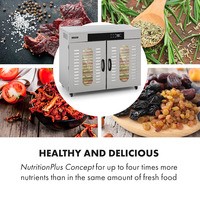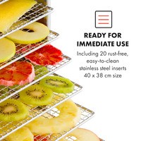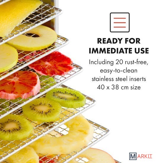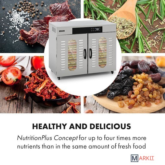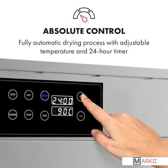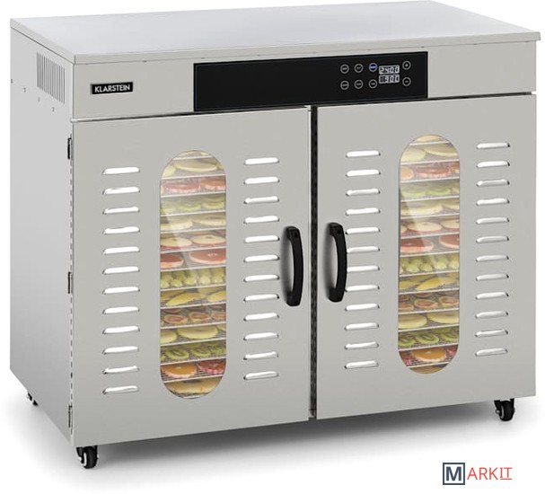 Мощный пищевой дегидратор Klarstein Master Jerky 500 сушит фрукты, овощи, мясо и другие продукты в рекордно короткие сроки. 32 съемных уровня для сушки из нержавеющей стали обеспечивают площадь 40 х 38 см при общей площади сушки 4,86 м² — идеальные условия для профессиональной сушки.Температуру на сенсорной панели можно регулировать от 40 до 90 °C для гибкого приготовления различных блюд. Кроме того, таймер до 24 часов обеспечивает оптимальную адаптацию к высушиваемым продуктам. Благодаря полностью автоматическому процессу сушки с точным соблюдением температурного режима все будет идеально.Полки из нержавеющей стали можно легко мыть или мыть в посудомоечной машине. Конструкция из нержавеющей стали легко моется и может перемещаться благодаря колесикам.Двигатель высокой производительности.Конструкция с двойными стенками для защиты от тепла и сохранения тепла внутри.Рассчитан на 32 - 48 кг продуктов.2 отдельные сушильные камерышум при работе: 45-50 дБнапольные роликипитание: 220 - 240 В ~ | 50/60 ГцРазмеры полки: примерно 40 x 38 см (Ш x Г)Длина сетевого кабеля: около 115 см