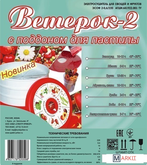 Markit » Сушилки для овощей и фруктов » Сушилка для овощей и фруктов Спектр-Прибор Ветерок-2 ЭСОФ-0,6/220 (6 поддонов, прозрачный, пастила)