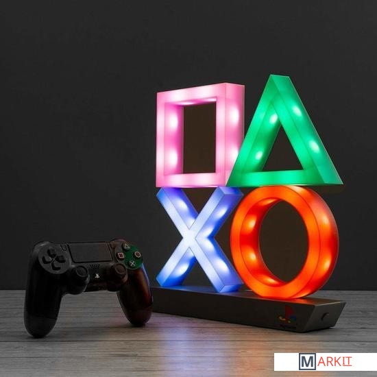 Подсветка с классическими символами кнопок контроллера PlayStation на гладком черном постаменте;Выберите один из 3 режимов освещения: стандартное освещение, фазировку цвета и реагирование на музыку;Этот продукт изготовлен с использованием BDP, что расшифровывается как Breakdown Plastic - органическая добавка, которая помогает пластику разлагаться на свалке, не влияя ни на его структурную целостность (до захоронения), ни на пригодность продукта к переработке.Питание: USB-кабель или 3 батарейки AAA (не входят в комплект);Playstation Icons Light - это официально лицензированный продукт.